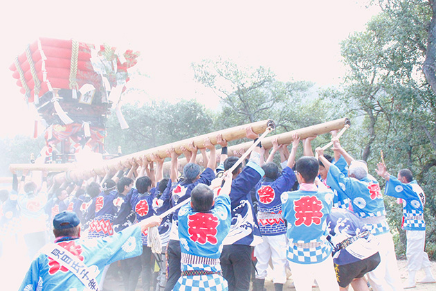 太鼓台は瀬戸内を中心に西日本一帯に見られる「舁(か)き山型」で、赤い布団型屋根や毎年作り変える装飾型屋根が特徴的。