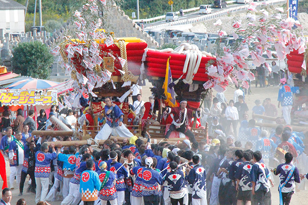 巨大な太鼓台同士がぶつかり合う“喧嘩太鼓”をする地域や、半島の地区が海から船で太鼓を運ぶ“オシコミ”をする地域等、地域によって