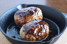 ②火が通ったらそのままのフライパンにもろみ大さじ1と水さじ1を入れて温めながらハンバーグと絡める。
